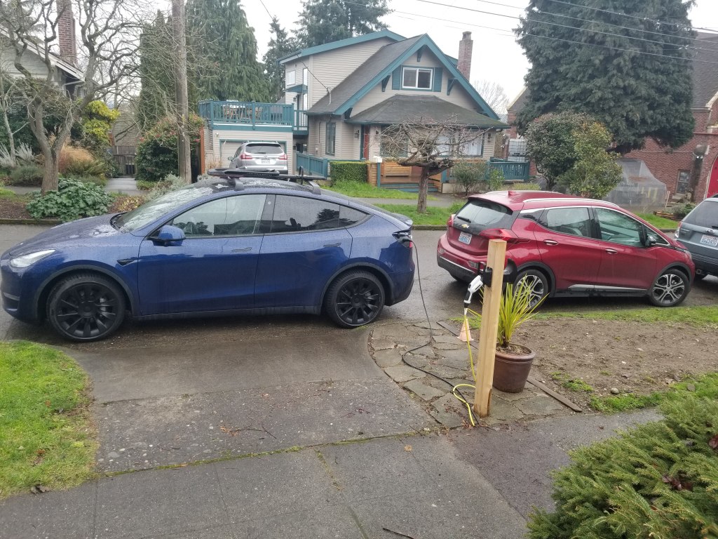 We are lucky in that there is a cut in the curb in front of our house which our neighbors have been kind enough to allow us to claim as our parking spot. I cleared this with our immediate neighbor Thom (who is most impacted) before buying our Bolt and he was happy to support our move to EVs.