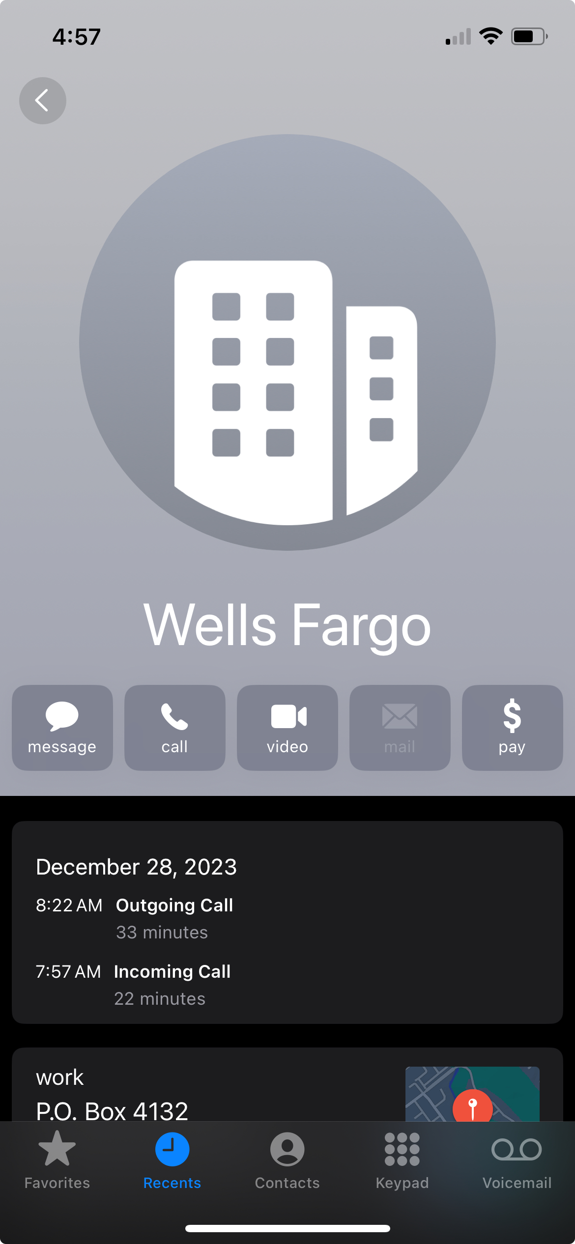 Now, as I mention, I don’t answer inbound calls from strangers and I NEVER answer calls from our bank, Wells Fargo. It’s much safer to let the call go to voicemail, and if you need to call them to handle a fraudulent charge or something, go to the website and call the number on the website. Initiating contact with your financial institution and calling a published number (rather than the number on the VM) is a great way to ensure you won’t get scammed–this way you can be sure you are talking to the bank. If you stop reading here, this is the one takeaway–always initiate the call.